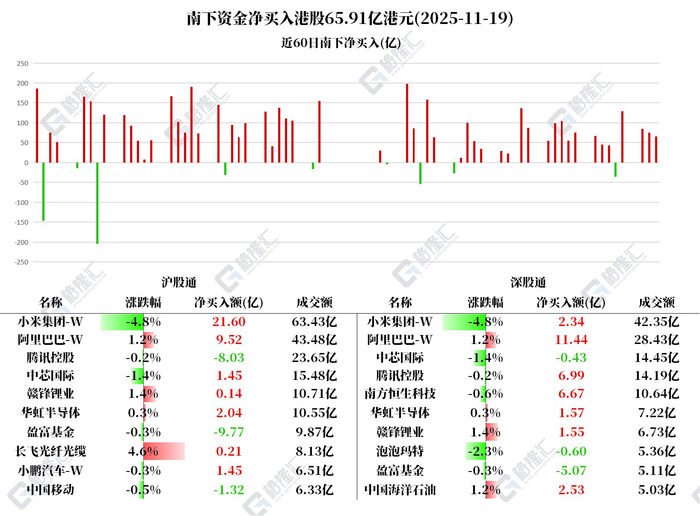 其中:净买入小米集团-W 23.94亿、阿里巴巴-W 20.96亿、南方恒生科技6.67亿、华虹半导体3.61亿、 中国海洋石油2.52亿、赣锋锂业1.68亿、小鹏汽车-W 1.45亿、中芯国际1.01亿;净卖出盈富基金14.84 亿、中国移动1.31亿、腾讯控股1.03亿。 11月19日,南下资金净买入港股65.91亿港元。 据统计,南下资金已连续16日净买入小米,共计130.5472亿港元;连续5日净买入阿里,共计110.96亿港 元。 华虹半导体:国信证券研报指出,华虹半导体3Q25业绩超指引,4Q25预期稳步增长。随着价格修复与 产品结构优化逐步体现,9厂产能进一步释放,业绩保持稳定增长。 中国海洋石油:OPEC+本月初决定暂停2026年第一季度的原油增产计划,以支撑油价。华泰证券发布 石油化工2026年度展望:原油供需面阶段性承压,大宗周期品迎复苏拐点,新材料和新技术亮点纷呈。 2026年内需改善叠加出口支撑,且"反内卷"等助力供给优化,新一轮复苏有望到来,具备全球竞争优势 的优质化工资产或将迎来价值重估。 赣锋锂业:碳酸锂期货主力合约强势突破10万元大关,主力合约涨近6%,创2024年6月以来新高 ...