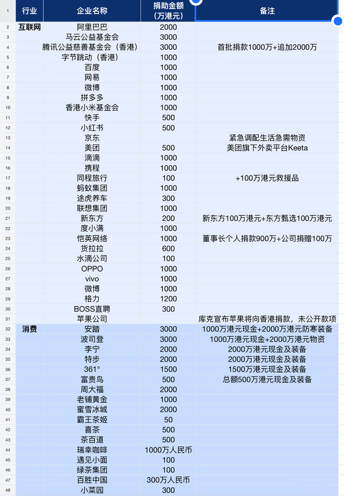 作者 | 第一财经 封图 | AI生成 11月26日下午,香港新界大埔屋邨宏福苑多栋住宅楼发生火灾,造成重大人员伤亡。据不完全统计,27日至28日,已有百余家企业及基金会捐款捐物, 用于受灾人群的紧急救援与过渡安置,并助力灾后社区恢复工作。截至目前,合计捐赠总额已超过12亿港元。 | | | 驰援香港大埔火灾救援,企业捐赠一览(不完全统计) | | | --- | --- | --- | --- | | 企业/基金会 | 捐赠情况 | 企业/基金会 | 捐赠情况 | | 越秀集团 | 1000万港元 | 中国海外、中国建筑公 | 捐赠2000万港元,员工个 | | | | lo | 人首批捐款208.06万港元 | | 广汽集团 | 600万港元 | 思摩尔 | 500万港元 | | 小米基金会 | 1000万港元 | 珀莱雅 | 500万港元 | | 腾讯 | 3000万港元 | 商汤科技 | 300万港元 | | 字节跳动 | 1000万港元 | 新东方及东方甄选 | 200万港元 | | 蚂蚁集团 | 1000万港元 | 蓝色光标 | 100万港元 | | 阿里巴巴 | 首批2000万港元 | 臭宝 | ...