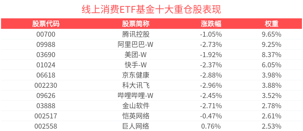 数据显示,截至2025年9月30日,中证沪港深线上消费主题指数(931481)前十大权重股分别为阿里巴巴-W(09988)、腾讯控股(00700)、快手-W(01024)、美团- W(03690)、京东健康(06618)、巨人网络(002558)、哔哩哔哩-W(09626)、科大讯飞(002230)、恺英网络(002517)、昆仑万维(300418),前十大权重股合计占比 55.76%。 | 股票代码 | 股票简称 | 涨跌幅 | 权重 | | --- | --- | --- | --- | | 00700 | 腾讯控股 | -1.05% | 9.65% | | 09988 | 阿里巴巴-W | -2.73% | 9.25% | | 03690 | 美团-W | -1.92% | 8.37% | | 01024 | 快手-W | -2.37% | 6.05% | | 06618 | 京东健康 | -2.88% | 3.98% | | 002230 | 科大讯飞 | -2.96% | 3.88% | | 09626 | 哔哩哔哩-W | -2.45% | 3.52% | | 03888 | 金山软件 | -2. ...