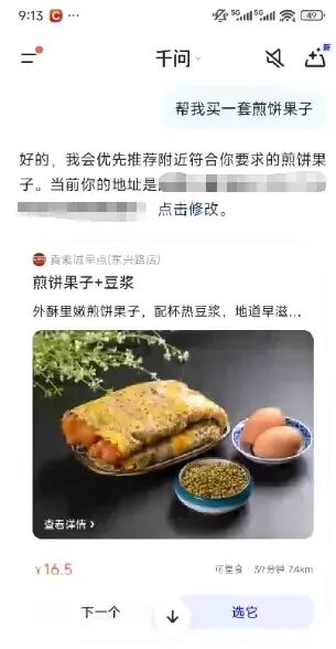 1月15日,千问App宣布全面接入淘宝、支付宝、淘宝闪购、飞猪、高德等阿里生态业务。对此,新京报贝壳财经记者第一时间就外卖、订购 机票等场景进行了测试。 外卖场景:推荐商家,自动提醒凑单 首先是外卖场景。正值早点时间,记者输入"帮我买一套煎饼果子",千问立刻显示出小字"正在使用淘宝闪购服务",并在约3秒后弹出了记者 本人在淘宝闪购常用的地址,同时弹出了一个商品卡片,自动匹配了一家早点铺。 ▲千问App下单外卖时的截图 记者注意到,该商品卡片有"下一个"和"选它"两个选项,当记者点击"选它"时,淘宝闪购会开始自动下单,不过触发了该商家"未满店铺起送 费"的设置,对此其贴心提醒可以凑单。由于起送价格太高,记者回拉聊天框,选择"下一个",找到了更为合适的商家,最终,在开通支付宝 付款后,记者成功在只通过千问App而不打开其他应用的前提下,买到了早点。 记者注意到,当首次使用千问执行上述场景,该应用会弹出相应的授权协议。如淘宝闪购的授权提醒显示,"使用您的手机号查询、绑定淘宝 闪购账号,完成授权后即可使用淘宝闪购收货地址,并由淘宝闪购为您提供商品交易服务。" 而首次使用支付宝付款时,其则提醒"我们会将你的注册手机号/ ...