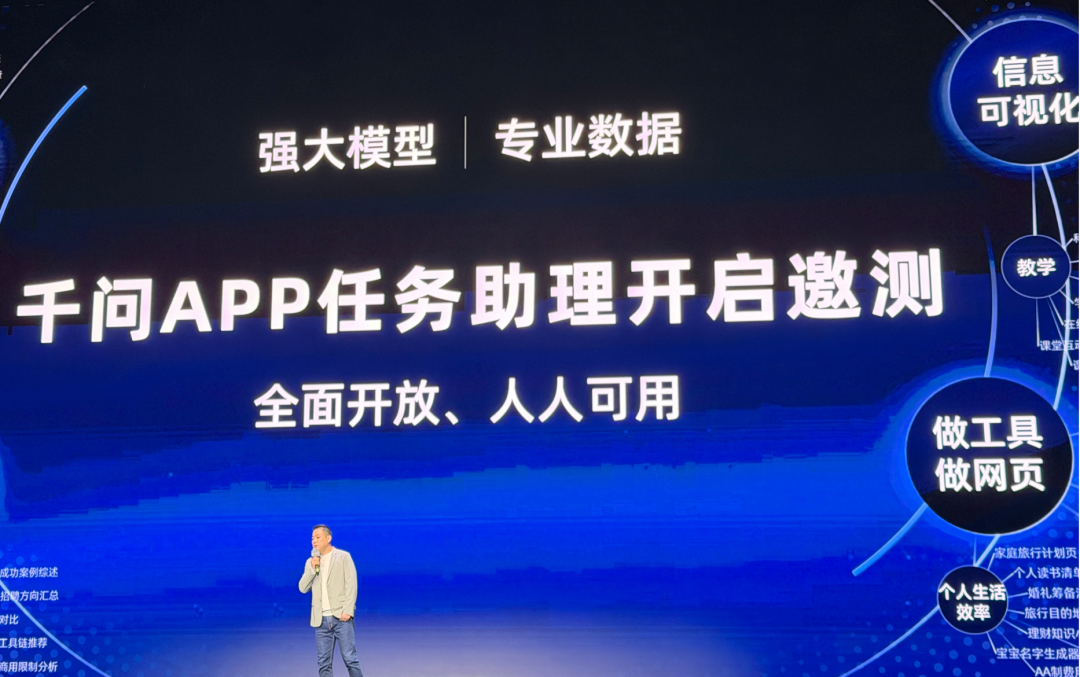 基于这三方面能力,吴嘉认为,未来在数字世界,人类和AI的角色互换会加速发生,未来两年,数字世界占比60%—70% 的常规任务都可能会由AI来直接执行和交付,剩余的创造性任务,也会因为有AI的深度参与而大幅提升效率。 一个业内共识是,AGI正在从Chat走向Agent,与现实世界产生更紧密的联系,从而释放出真正的生产力。此前在清华大学 基础模型北京市重点实验室发起的AGI-Next前沿峰会上,阿里千问技术负责人林俊旸表示,未来AI Agent需要能够与物理 世界交互,比如参与实验、制造和科学探索,释放出真正的工作能力。 发布会上,阿里巴巴集团副总裁吴嘉介绍,上线不到两个月,千问C端月度活跃用户已突破1亿。随后,他用千问App"一 句话"点了四十杯奶茶,并表示,在AI时代,面向用户提供的服务都会离用户需求的原点更近,直接承载用户的需求,用 户也不需要自行拆解需求,在各个App之间切换。 图片来源:阿里巴巴发布会截图 吴嘉强调,未来在数字世界办事的主力会变成AI,AI会从副驾驶走向主驾驶。吴嘉介绍,AI能办事,主要依赖于三个非 常重要的能力。 一是千问大模型的coding能力大幅提升;二是全模态理解能力突破,这是A ...
