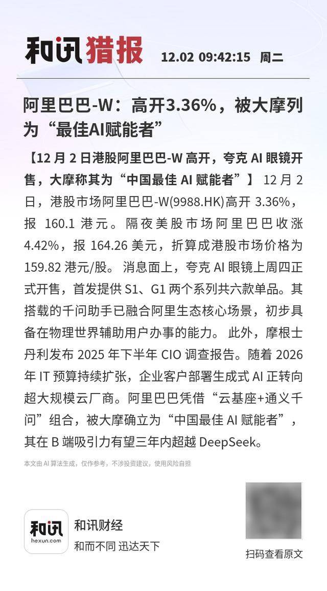 【12 月 2 日港股阿里巴巴-W 高开,夸克 AI 眼镜开售,大摩称其为"中国最佳 AI 赋能者"】12 月 2 日,港股市场阿里巴巴-W(9988.HK)高开 3.36%,报 160.1 港元。隔夜美股市场阿里巴巴收涨 4.42%, 报 164.26 美元,折算成港股市场价格为 159.82 港元/股。消息面上,夸克 AI 眼镜上周四正式开售,首 发提供 S1、G1 两个系列共六款单品。其搭载的千问助手已融合阿里生态核心场景,初步具备在物理世 界辅助用户办事的能力。此外,摩根士丹利发布 2025 年下半年 CIO 调查报告。随着 2026 年 IT 预算持 续扩张,企业客户部署生成式 AI 正转向超大规模云厂商。阿里巴巴凭借"云基座+通义千问"组合,被 大摩确立为"中国最佳 AI 赋能者",其在 B 端吸引力有望三年内超越 DeepSeek。 本文由 AI 算法生成,仅作参考,不涉投资建议,使用风险自担 本文由 Al 算法生成,仅作参考,不涉投资建议,使用风险自担 和讯财经 和而不同 迅达天下 扫码查看原文 具在 B 端吸引刀有望三年闪超越 DeepSeek。 ...