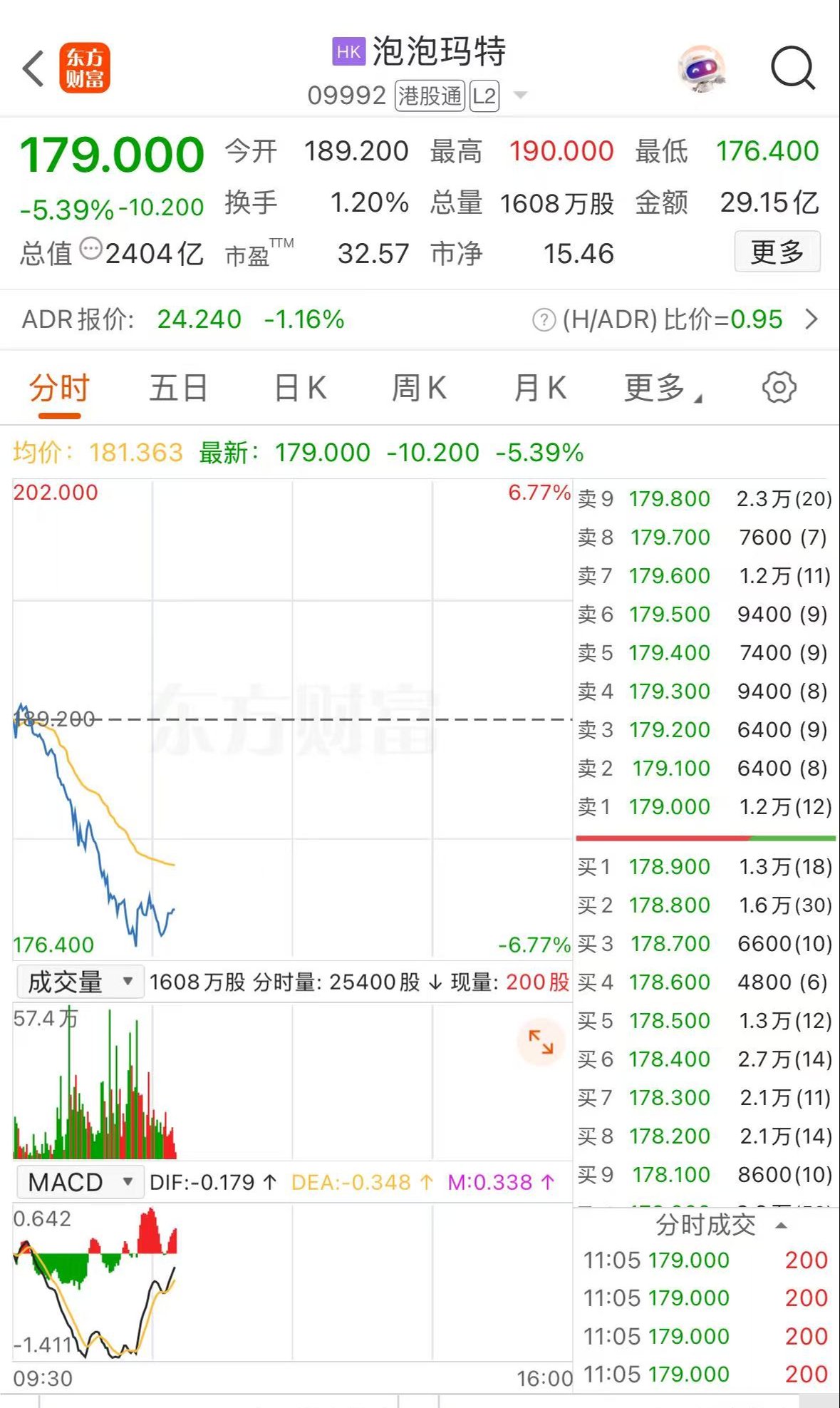 来源:上海证券报·中国证券网 上证报中国证券网讯(记者 刘逸鹏)1月16日,泡泡玛特一度跌近7%,截至11时05分,跌幅收窄至5.39%,报179港元/股。 消息面上,摩根士丹利报告指出,泡泡玛特正在从过去两年的"爆发式增长"阶段,过渡到未来的"可持续增长"阶段。该机构预测泡泡玛特2026年Labubu的收 入增速将显著放缓,增长引擎将由单一爆款转向非Labubu IP的多元化驱动。 来源:上海证券报·中国证券网 上证报中国证券网讯(记者 刘逸鹏)1月16日,泡泡玛特一度跌近7%,截至11时05分,跌幅收窄至5.39%,报179港元/股。 | HK 泡泡玛特 | | | | | --- | --- | --- | --- | | 09992 港股通 L2 ▼ | | | | | 179.000 今开 189.200 最高 190.000 最低 176.4 | | | | | 1.20% 总量 1608万股 金额 29.15 -5 20%-10 200 快+ | | | | | 总值 2404亿 市盈 " 田 32.57 市净 15.46 | | | | | ADR报价: 24.240 -1.16% ? (H/ ...