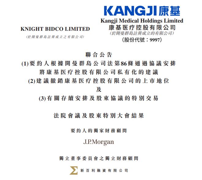 Group 1 - Knight Bidco Limited's proposal to privatize Kangji Medical (09997.HK) has been approved by the company's shareholders on November 10, 2025, marking a significant milestone for the company [1] - The privatization plan is pending approval from the Grand Court of the Cayman Islands and will take effect after court registration, with the last trading time for the stock set for 4:10 PM the following day [1] - Following the plan's effectiveness, the company's shares are expected to be delisted from the Hong Kong Stock Exchange on December 9 at 4:00 PM [1] Group 2 - Kangji Medical was listed on the Hong Kong Stock Exchange on June 29, 2020, with an IPO price of HKD 13.88, raising approximately HKD 35.98 billion [1] - Currently, the stock is trading at HKD 9.16, representing a decline of over 34% from the IPO price, with a market capitalization of approximately HKD 110.65 billion [1]