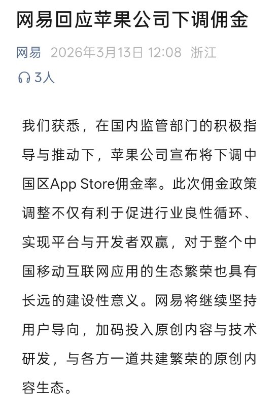 新浪科技讯 3月13日下午消息,今日,网易官方发文回应苹果公司下调佣金,网易表示,在国内监管部 门的积极指导与推动下,苹果公司宣布将下调中国区App Store佣金率。此次佣金政策调整不仅有利于 促进行业良性循环、实现平台与开发者双赢,对于整个中国移动互联网应用的生态繁荣也具有长远的建 设性意义。 网易表示,将继续坚持用户导向,加码投入原创内容与技术研发,与各方一道共建繁荣的原创内容生 态。 网易官方原文如下:我们获悉,在国内监管部门的积极指导与推动下,苹果公司宣布将下调中国区App Store佣金率。此次佣金政策调整不仅有利于促进行业良性循环、实现平台与开发者双赢,对于整个中 国移动互联网应用的生态繁荣也具有长远的建设性意义。网易将继续坚持用户导向,加码投入原创内容 与技术研发,与各方一道共建繁荣的原创内容生态。 责任编辑:江钰涵 ...