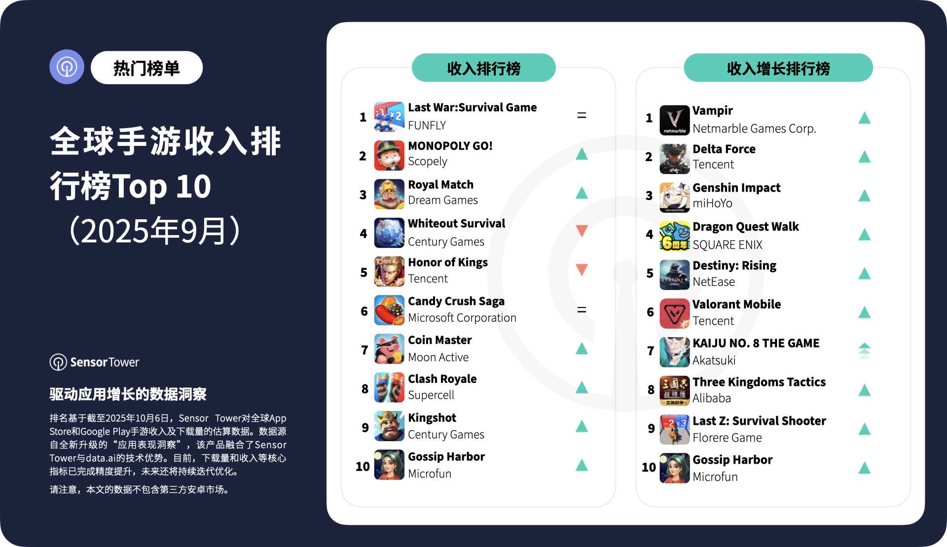 智通财经APP获悉,Sensor Tower发布2025年9月全球手游收入与下载量排行榜TOP10。《Last War: Survival Game》登顶2025年9月全球手游收入榜。 《MONOPOLY GO! 》紧随其后位列第2,《Royal Match》位列第3。《Whiteout Survival》和《王者荣耀》也成功跻身前五。 根据 Sensor Tower 的"应用表现洞察"数据,FUNFLY旗下的《Last War: Survival Game》持续位居全球手游收入榜首。《MONOPOLY GO!》和《Royal Match》均上升两位,分列第2、3位。《Whiteout Survival》和《王者荣耀》则共同跻身前五。 9月《Last War: Survival Game》持续通过其轮换活动日程来推动玩家消费。玩家社区和数据显示,热门促销等关键变现机制保持活跃,包括"自定义周通行 证"、"特殊训练通行证"和"全面动员",为英雄碎片、资源和装备提供了深度折扣。同时,"联盟对决VS"等周期性PvP和联盟竞技活动也提供了排行榜奖励和 英勇徽章。此外,"将军试炼"、"僵尸围城"和"军备竞赛"等核心活动 ...