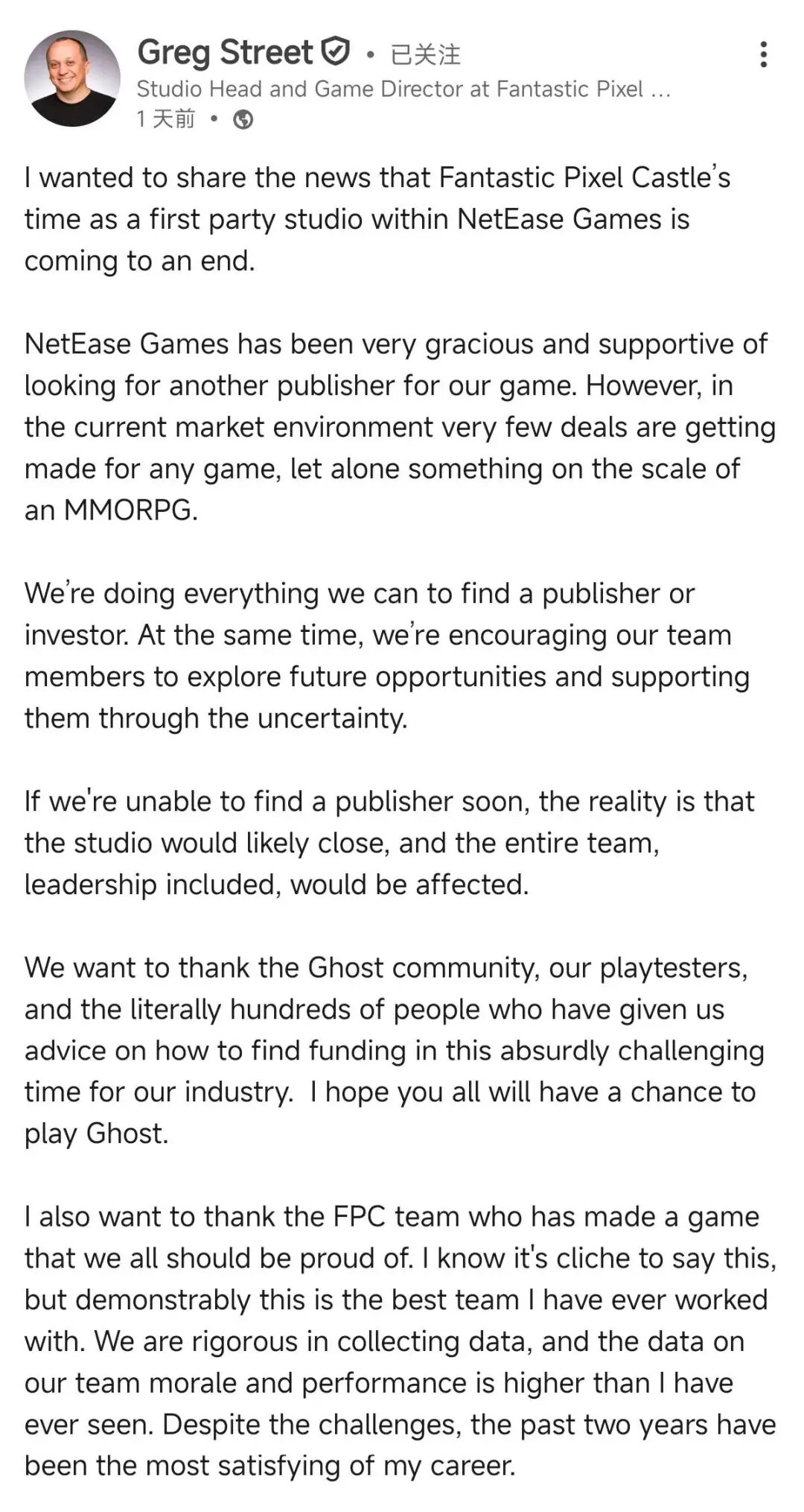 网易在海外的第一方工作室Fantastic Pixel Castle Studio创始人Greg Street昨日(10月10日)在领英发文,宣布该工作室「作为网易游戏旗下第一方工作室 的阶段即将结束」。工作室当前正全力寻找新的发行商和投资者,如果短期内没能找到,工作室可能不得不整体关闭。 文章末尾有全文翻译 这位Greg Street绝对算是明星制作人,曾以「鬼蟹」Ghost Crawler的名号,在微软、暴雪和拳头游戏任职,曾担任《魔兽世界》首席系统设计师、《英雄 联盟》首席玩法设计师、《英雄联盟》衍生MMO游戏执行制作人,拥有20多年的游戏研发经验。 工作室在研一款3A MMO,暂定名为《Ghost》。游戏在去年先后发布了几则视频,旨在真实地展现这款游戏开发初期的样貌,从而尽早与玩家沟通。能 看到在玩法测试阶段的游戏还相当简陋,大量采用了Unity商店的免费素材,但整体玩法已经初具雏形。 实机演示 概念设计稿 据介绍,这款游戏的创新之处在于尝试解决MMO游戏逐渐单机化的问题。游戏整体分为了三个部分,分别承担不同的功能。城市是社交和交易的中心, 「红区」则承担了传统MMO的多人合作副本功能,提供挑战性。 ...