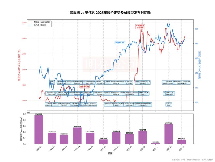 AI大规模投资的趋势可能仍将延续到明年。 交银国际的最新研报分析认为,AI基础设施建设至少在 2026 年或继续强劲增长,"海外主要云厂商资本开支,在2024/25 年同比分别增长60%以上的基础 上,2026 年或继续增长30%以上"。 在此背景下,结合寒武纪(688256.SH)在今年市值的快速增长,让市场开始寻找"下一个寒武纪"。上周五摩尔线程(688795.SH)正式登陆科创板。股价 连续大幅上涨至11日,但在12日上午有所回调。 有观点认为,将"寒武纪"对标"英伟达"是当下核心估值叙事,因而摩尔线程的逻辑可以至少按照"对标英伟达、追赶寒武纪"方式来计算。截至发稿,英伟 达的市值4.39万亿美元、市盈率(TTM)约45倍;寒武纪市值约5880亿人民币、市盈率(TTM)313倍;摩尔线程市值3900亿美元,仍未盈利。 本期"估值叙事",「明亮公司」试图探讨"中国英伟达们"的叙事逻辑。 8月-12月初,英伟达的市值一度突破5万亿美元,但市场对于AI投资"泡沫"的担忧也越来越甚,英伟达的股价也在这一阶段呈明显的震荡趋势。而寒武纪 在8月份(单月)股价大幅上涨,9月份开启了震荡模式。 寒武纪和英伟达的走势「背 ...