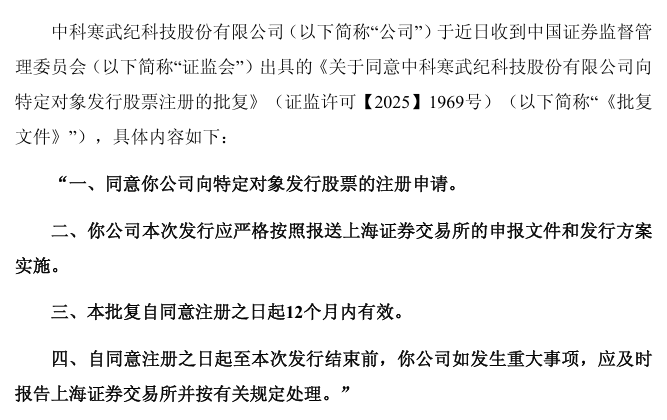 【公告精选】寒武纪定增申请获证监会同意注册批复
