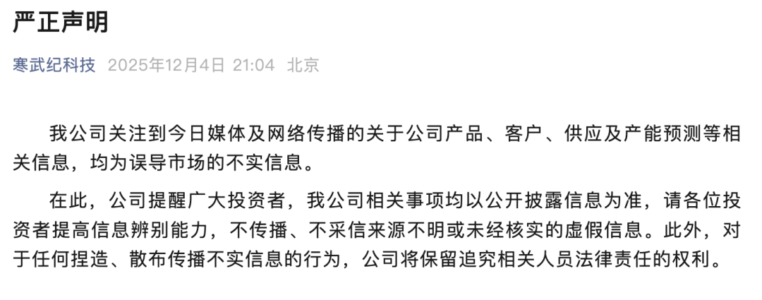 12月4日晚,寒武纪发布严正声明称,我公司关注到今日媒体及网络传播的关于公司产品、客户、供应及产能预测等相关信息,均为误导市场 的不实信息。 在此,公司提醒广大投资者,我公司相关事项均以公开披露信息为准,请各位投资者提高信息辨别能力,不传播、不采信来源不明或未经核 实的虚假信息。 此外,对于任何捏造、散布传播不实信息的行为,公司将保留追究相关人员法律责任的权利。 12月4日,寒武纪尾盘短线快速拉升,截至收盘涨2.75%,报1369元/股。 (声明:文章内容仅供参考,不构成投资建议。投资者据此操作,风险自担。) 来源丨 寒武纪科技、公开行情 编辑丨江佩佩 见习编辑张嘉钰 飞天茅台跌至1545元,段永平回应拼多多1399元茅台 起底教育盗版灰色产业链 SFC 21君荐读 港股科技股急拉,小米涨超4%,铜价飙涨创新高,高盛发出警告 ...