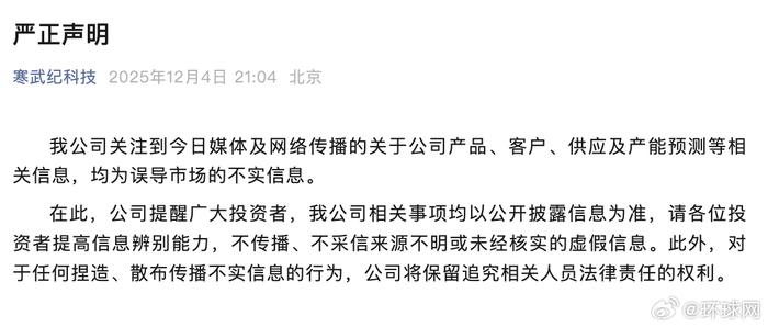 【#寒武纪声明报道不实#】#寒武纪提醒投资者#12月4日,寒武纪发布严正声明:寒武纪公司关注到今 日媒体及网络传播的关于公司产品、客户、供应及产能预测等相关信息,均为误导市场的不实信息。在 此,公司提醒广大投资者,公司相关事项均以公开披露信息为准,请各位投资者提高信息辨别能力,不 传播、不采信来源不明或未经核实的虚假信息。此外,对于任何捏造、散布传播不实信息的行为,公司 将保留追究相关人员法律责任的权利。 ...