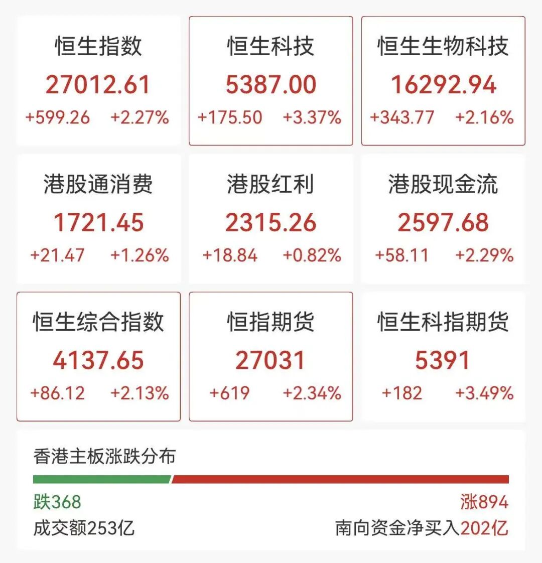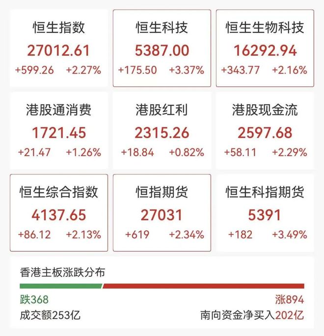 | 恒生指数 | 恒生科技 | 恒生生物科技 | | --- | --- | --- | | 27012.61 | 5387.00 | 16292.94 | | +599.26 +2.27% | +175.50 +3.37% | +343.77 +2.16% | | 港股通消费 | 港股红利 | 港股现金流 | | 1721.45 | 2315.26 | 2597.68 | | +21.47 +1.26% +18.84 +0.82% | | +58.11 +2.29% | | 恒生综合指数 | 恒指期货 | 恒生科指期货 | | 4137.65 | 27031 | 5391 | | +86.12 +2.13% | +619 +2.34% | +182 +3.49% | | 跌368 | 涨894 | | --- | --- | | 成交额253亿 | 南向资金净买入202亿 | 盘面上,科网股普涨,美团涨超5%,京东涨近4%,网易、快手涨超3%,京东、阿里巴巴涨近3%。 半导体板块高开,中芯国际、华虹半导体涨超4%。黄金股普遍上涨,中国黄金(600916)国际涨超3%;汽车股活跃,吉利涨超1%。 智谱、Min ...