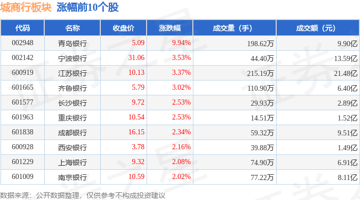 从资金流向上来看,当日城商行板块主力资金净流入7.24亿元,游资资金净流入8565.32万元,散户资金 净流出8.1亿元。城商行板块个股资金流向见下表: | 代码 | 名称 | 主力净流入(元) | 主力净占比 游资净流入 (元) | | 游资净占比 散户净流入(元) | | 散户净占比 | | --- | --- | --- | --- | --- | --- | --- | --- | | 600919 江苏银行 | | 2.49 Z | 13.77% | -2499.87万 | -1.38% | -2.24 Z | -12.39% | | eoilea | 北京银行 | 2.15 Z | 16.03% | -3997.26万 | -2.97% | -1.75 Z | -13.06% | | 601229 上海银行 | | 1.08亿 | 13.65% | 4314.61万 | 5.44% | -1.51 Z | -19.09% | | 6000009 | 南京银行 | 8171.13万 | 11.53% | 3568.90万 | 5.04% | -1.17 Z | -16.56% | | 601838 ...