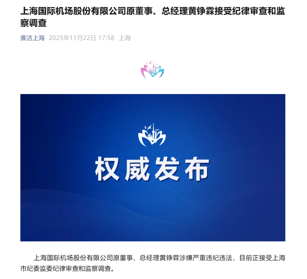 据"廉洁上海"公众号消息,上海国际机场股份有限公司原董事、总经理黄铮霖涉嫌严重违纪违法,目 前正接受上海市纪委监委纪律审查和监察调查。 ...