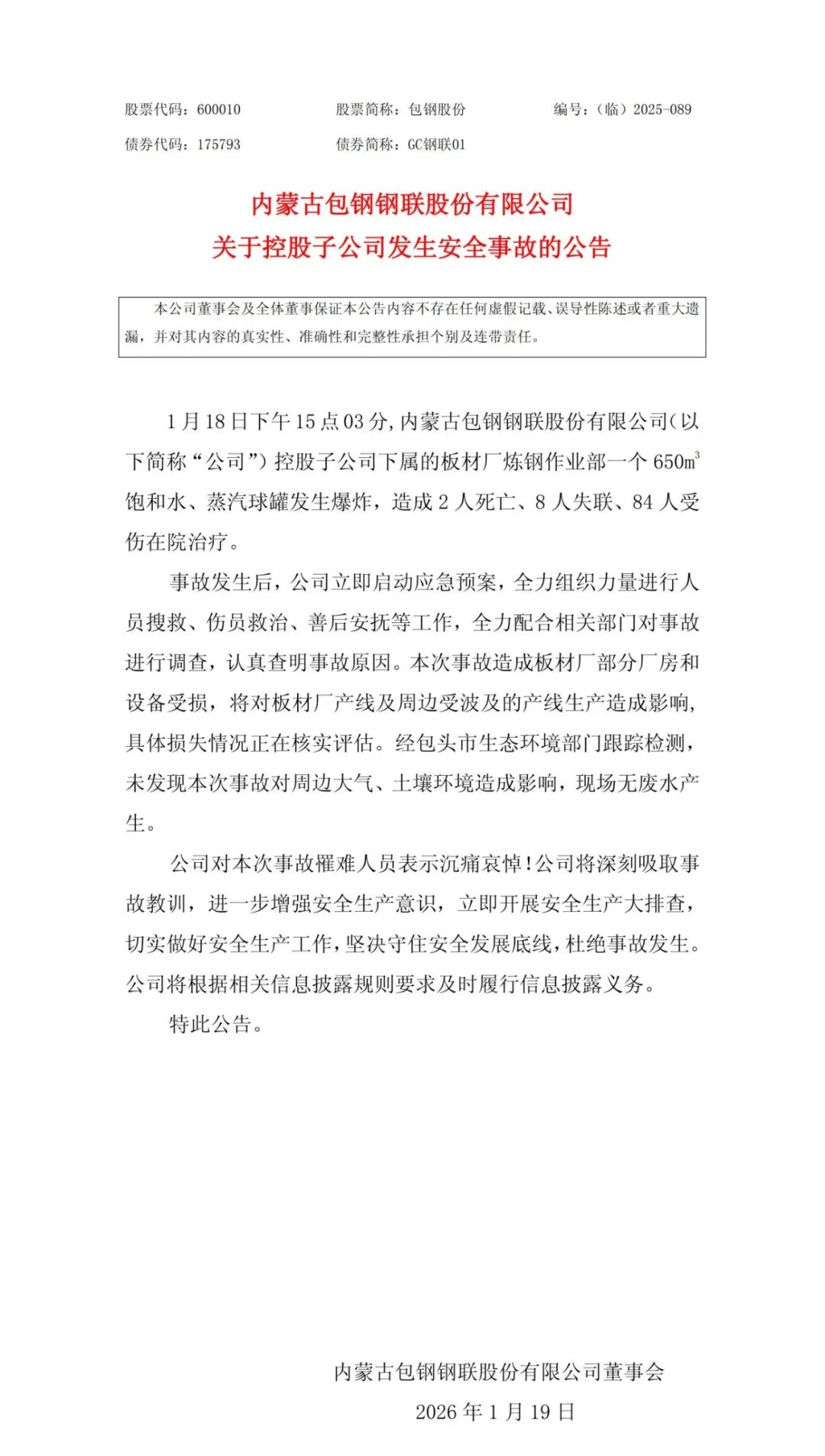 登录新浪财经APP 搜索【信披】查看更多考评等级 本文转自【央广网】; 包钢股份1月19日发布《内蒙古包钢钢联股份有限公司关于控股子公司发生安全事故的公告》: 1月18日15时03分,公司控股子公司下属的板材厂炼钢作业部一个650m³饱和水、蒸汽球罐发生爆炸,造成2人死亡、8人失联、84人受伤在院治疗。公司 对本次事故罹难人员表示沉痛哀悼!公司将深刻吸取事故教训,进一步增强安全生产意识,立即开展安全生产大排查,切实做好安全生产工作,坚决守住 安全发展底线,杜绝事故发生。公司将根据相关信息披露规则要求及时履行信息披露义务。 全文如下↓ 来源:"上海证券交易所"官网 | 股票代码:600010 | 股票简称:包钢股份 | 编号:(临)2025-089 | | --- | --- | --- | | 债券代码:175793 | 债券简称:GC钢联01 | | ...