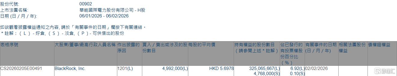 格隆汇2月6日丨根据联交所最新权益披露资料显示,2026年2月2日,华能国际电力股份(00902.HK)遭BlackRock, Inc.在场内以每股均价5.6978港元减持499.2 万股,涉资约2844.34万港元。 减持后,BlackRock, Inc.最新持股数目为325,065,667股,持股比例由7.02%下降至6.92%。 | 股份代號: | | --- | | 上市法國名稱: | | 日期 (日 / 月 / 年): | | 要格密號 | 大股東/董事/最高行政人員名稱 作出披露的 賈入 / 曹出或涉及的股每股的平均價 | | | 持有權益的股份數目 佔已發行的 有關事件的日 | | | --- | --- | --- | --- | --- | --- | | | 行動 = | | | (請參閱上述*註解)有投票權股(日/月/年 | | | | | | | 分自分比 | | | CS20260205E00491 | BlackRock, Inc. 1201(L) | 4,992,000(L | HKD 5.6978 | 325,065,667(L) | 6.92(L)02/02/2026 | | ...