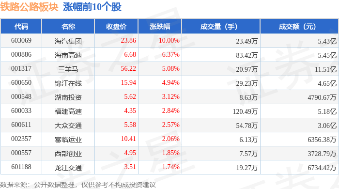 证券之星消息,12月19日铁路公路板块较上一交易日上涨0.42%,海汽集团领涨。当日上证指数报收于 3890.45,上涨0.36%。深证成指报收于13140.22,上涨0.66%。铁路公路板块个股涨跌见下表: | 代码 | 名称 | 主力净流入(元) | 主力净占比 游资净流入(元) | | 游资净占比 散户净流入 (元) | | 散户净占比 | | --- | --- | --- | --- | --- | --- | --- | --- | | 600611 | 大众交通 | 5835.66万 | 19.07% | -2070.68万 | -6.77% | -3764.98万 | -12.30% | | 603069 | 海汽集团 | 5554.08万 | 10.23% | -3166.88万 | -5.84% | -2387.19万 | -4.40% | | 001317 | 三手马 | 5209.40万 | 4.53% | -2767.11万 | -2.40% | -2442.29万 | -2.12% | | 600650 | 锦江在线 | 4608.73万 | 9.92% | -1564.89万 | ...