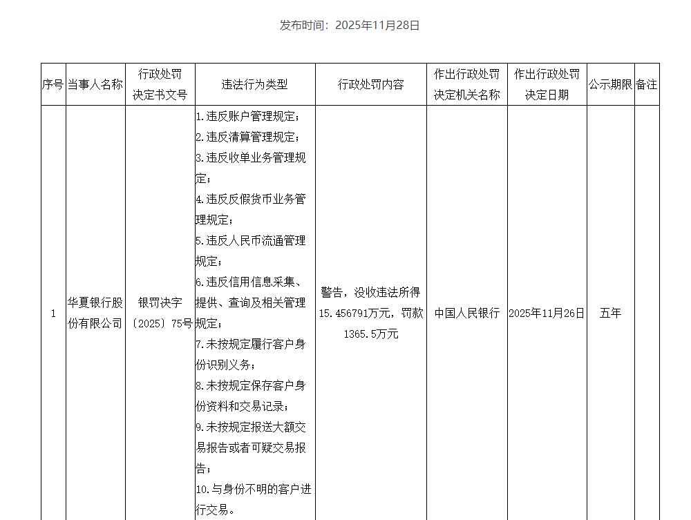 Core Viewpoint - Huaxia Bank was fined a total of 13.8096 million yuan due to 10 business violations, and the bank has stated that all issues have been rectified [2][5]. Summary by Category Regulatory Actions - The People's Bank of China announced that Huaxia Bank was penalized for 10 violations, including breaches of account management, clearing management, and anti-counterfeit currency regulations [2][3]. - The total penalty included the confiscation of illegal gains amounting to 154,567.91 yuan and a fine of 13.655 million yuan [2][3]. Violations - Specific violations included: 1. Violating account management regulations 2. Violating clearing management regulations 3. Violating acquiring business management regulations 4. Violating anti-counterfeit currency regulations 5. Violating RMB circulation management regulations 6. Violating credit information collection and management regulations 7. Failing to perform customer identity verification as required 8. Failing to retain customer identity information and transaction records as required 9. Failing to report large transactions or suspicious transactions as required 10. Conducting transactions with unidentified customers [2][3][5]. Management Response - Huaxia Bank acknowledged the penalties and emphasized that it has taken the issues seriously, conducting a thorough analysis of the causes and implementing corrective measures [5]. - The bank reported that all identified issues have been fully rectified [5]. Financial Performance - As of the end of Q3 2025, Huaxia Bank's total assets reached 45,863.58 billion yuan, an increase of 2,098.67 billion yuan or 4.80% from the previous year [6]. - The bank's operating income for the first three quarters was 648.81 billion yuan, a year-on-year decrease of 8.79%, while the net profit attributable to shareholders was 179.82 billion yuan, down 2.86% year-on-year [6]. - The non-performing loan ratio stood at 1.58%, a decrease of 0.02 percentage points from the end of the previous year, while the provision coverage ratio was 149.33%, down 12.56 percentage points [6].