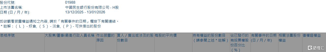 | 張格序號 | 大股東/董事/最高行政人員名稱 作出披露的 買入 / 賣出或涉及的股 每股的平均價 | | | | 持有權益的股份數目 佔已發行的 有關事件的 | | --- | --- | --- | --- | --- | --- | | | 份數 言 | | | | (請參閱上班 *註解)有投票權版(日/月/年 | | | | | | | 份自分 标 | | | | | | | 96 | | CS20260112E00525 | JPMorgan Chase & Co. | 1101(L) | 4,401,354(L) | HKD 3.9012 | 666.636,302(L) 8.01(L)07/01/2026 | | | | | | | 95.401.690(S) 1.14(S) | | | | | | | 172,808,533(P) 2.07(P) | | 股份代號: | 01988 | | --- | --- | | 上市法國名稱: | 中國民生銀行股份有限公司 - H股 | | 日期 (日 / 月 / 年): | 13/12/2025 - 13/01/2026 | 格隆汇1月13日丨根据联 ...