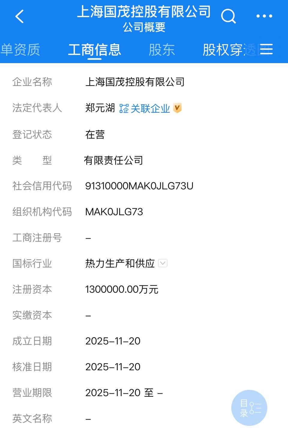Company Overview - Shanghai Guomao Holdings Co., Ltd. has completed its business registration on November 20, with a registered capital of 13 billion yuan [1][2] - The company is classified under the industry of heat production and supply, with business operations including port operations, gas operations, biomass gas production and supply, and internet information services [1][2] Shareholding Structure - The shareholding structure of Shanghai Guomao Holdings is as follows: Shanghai International Group Co., Ltd. invested 3 billion yuan, holding a 23.08% stake; Shanghai Port Group invested 2 billion yuan, holding a 15.38% stake; and eight other state-owned enterprises in Shanghai collectively invested 8 billion yuan, holding a total of 61.54% [5][6] - The participation of Shanghai Port Group is aimed at leveraging its public port resource advantages and logistics supply chain system to enhance the role of Shanghai Port as an international shipping hub [6] Management Information - The chairman of Shanghai Guomao Holdings is Zheng Yuanhu, with Luo Dongyuan serving as the director and manager, and Yang Haifeng as the financial officer [7] - Zheng Yuanhu has a background in business management and previously served as the president of Shanghai Jiushi Group [9]