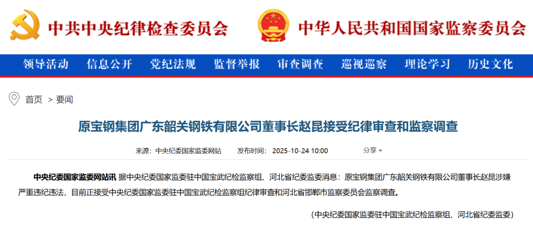 Core Points - Zhao Kun, the former chairman of Baosteel Group Guangdong Shaoguan Steel Co., Ltd., is under disciplinary review and investigation for serious violations of discipline and law [1][6] - Zhao has held significant positions within Baosteel Group, including Vice General Manager and Party Committee Member [3] - This marks the second investigation into Zhao, highlighting the ongoing anti-corruption efforts within the organization [6] Group 1: Disciplinary Actions - Zhao Kun is currently undergoing a disciplinary review by the Central Commission for Discipline Inspection and the Hebei Provincial Commission [1] - In 2015, Zhao was previously penalized for violating the Central Eight Regulations, resulting in the revocation of his party position and vice general manager role [5] - The investigation revealed multiple instances of misuse of public funds, including extravagant receptions and personal benefits [5][6] Group 2: Organizational Context - China Baowu Steel Group Co., Ltd. is a major state-owned enterprise directly managed by the central government and is one of the largest steel conglomerates globally [6] - The company has undergone several mergers and reorganizations since 2016, including the merger with Wuhan Steel Group [6] - The ongoing investigations into various executives within China Baowu reflect a broader commitment to anti-corruption within the state-owned enterprise sector [6]