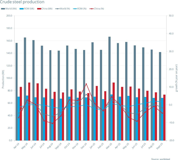 世界钢铁协会:9月全球粗钢产量为1.418亿吨 同比下降1.6%