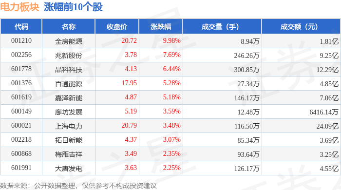 证券之星消息,1月6日电力板块较上一交易日上涨0.77%,金房能源领涨。当日上证指数报收于 4083.67,上涨1.5%。深证成指报收于14022.55,上涨1.4%。电力板块个股涨跌见下表: | 代码 | 名称 | 收盘价 | 涨跌幅 | 成交量(手) | 成交额(元) | | | --- | --- | --- | --- | --- | --- | --- | | 001210 | 金房能源 | 20.72 | 9.98% | 8.94万 | | 1.81亿 | | 002256 | 兆新股份 | 3.78 | 7.69% | 246.26万 | | 9.25 6 | | 601778 | 晶科科技 | 4.13 | 6.44% | 300.85万 | | 12.29亿 | | 001376 | 百通能源 | 17.95 | 5.28% | 27.34万 | | 4.85亿 | | 619109 | 嘉泽新能 | 4.87 | 5.18% | 146.17万 | | 7.06亿 | | 600149 | 廊坊发展 | 5.19 | 3.59% | 12.48万 | | 6416.14万 | | 6000 ...