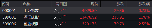 | 代码 | 名称 | 两日图 | 现价 | 涨跌 | 涨跌幅 | | --- | --- | --- | --- | --- | --- | | 000001 | 上证指数 | Samo | 4029.50 | 29.36 | 0.73% | | 399001 | 深证成指 | 24 N | 13476.52 | 235.91 | 1.78% | | 399006 | 创业板指 | 15.00 WW | 3201.75 | 79.73 | 2.55% | 沪深两市成交额2.04万亿,较上一个交易日放量969亿。全市场近4000只个股上涨。 11月13日,A股市场全天震荡走强,截至收盘,沪指涨0.73%,续创十年新高;深成指涨1.78%,创业板 指涨2.55%。 【资金流向】 主力资金全天净流入电池、有色金属、半导体等板块,净流出电子元件、证券、电力等板块。 具体到个股来看,宁德时代、兆易创新、英维克获净流入26.55亿元、18.08亿元、16.86亿元。 净流出方面,香农芯创、上海电力、阿特斯遭抛售8.49亿元、4.85亿元、4.69亿元。 【机构观点】 东莞证券:当前市场处于风格切换关键期,政策托底与流动 ...