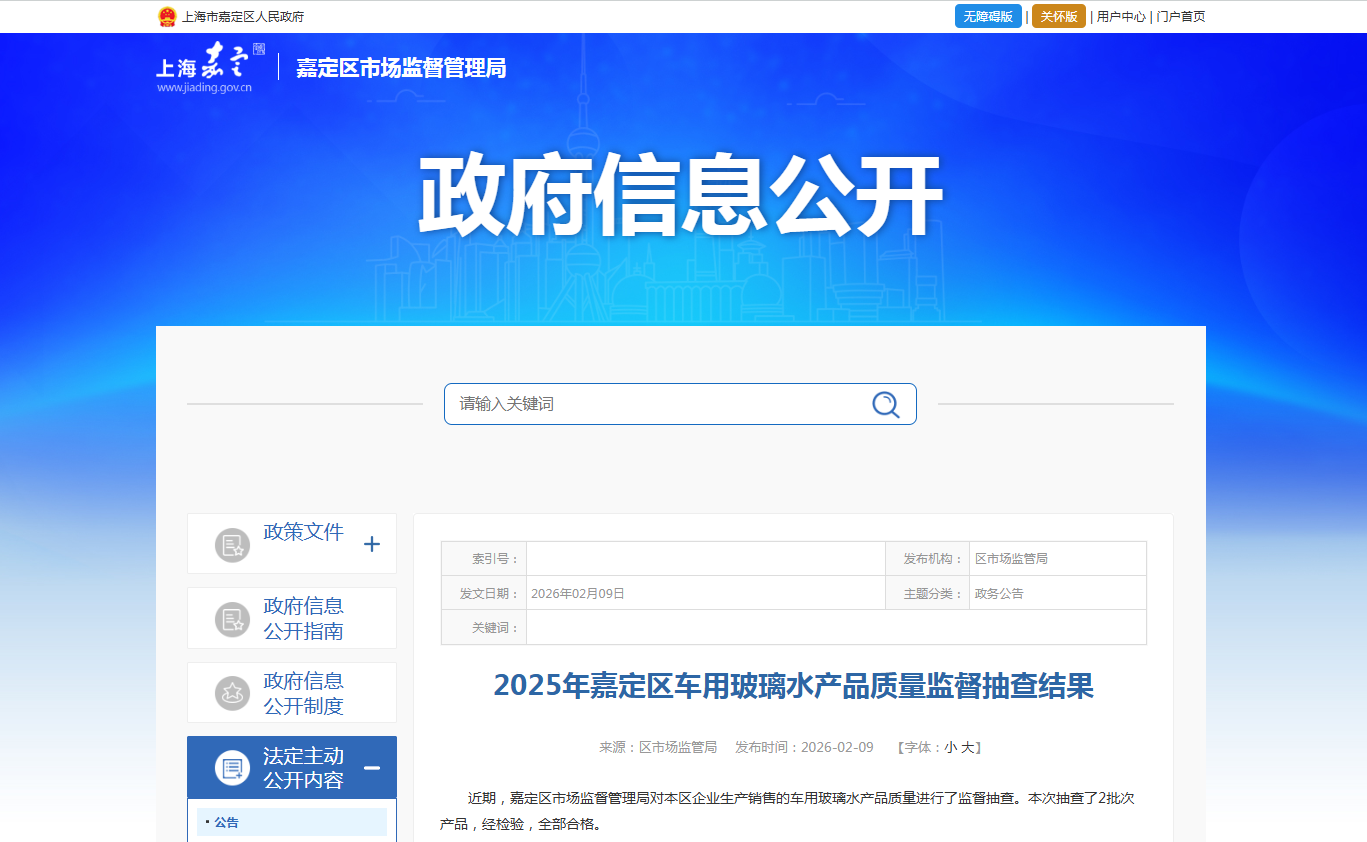2025年上海市嘉定区车用玻璃水产品质量监督抽查结果公布
