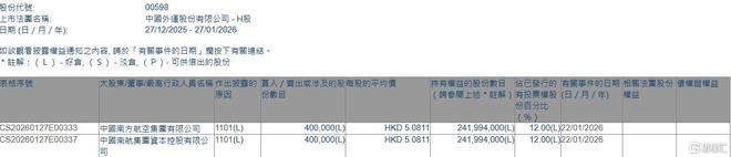 | 2000 | 次發展發重機能分改人員名譽 (出版國的 員 Y ) 其中國際發動發展舞蹈的是韓國 | | | | MANTERS BE REGER HEREAS HERE FOR HERE FOR | | | | --- | --- | --- | --- | --- | --- | --- | --- | | | | a | Deal 200 | | (終多爾上越,世稱)存股票價股(日/月/第) 脚益 | | | | CS20260127E00333 | 中國獨方航空處國有限公司 400,000(L) | H101(L) | | HKD 5.0811 | 241,994,000(L) 12,00(L)22/01/2026 | | | | CS20260127E00337 | 中國酒批傳圖宜本抄股有限公 (101(L) 400,000(L) | | | HKD 5.0811 | 241,994,000(L) | 12.00(L)22/01/2026 | CS MULTER | 格隆汇1月27日丨根据联交所最新权益披露资料显示,2026年1月22日,中国外运(00598.HK)获中国南方 航空集团有限公司在场 ...