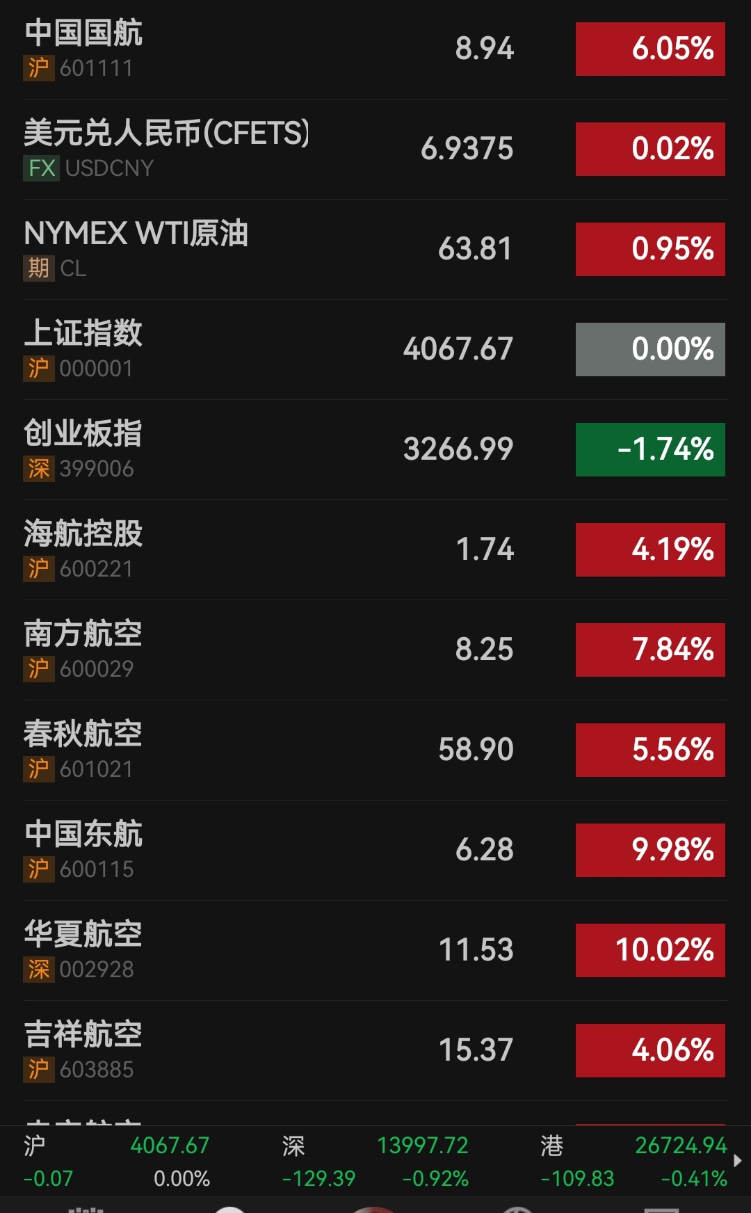 2026.02. 04 本文字数:947,阅读时长大约1分钟 作者 | 第一财经 陈姗姗 2月4日,A股航空板块集体大涨。截至中午收盘,华夏航空和中国东航涨停,南方航空和中国国航涨幅也超过6%。 | 中国国航 | | | 8.94 | | 6.05% | | --- | --- | --- | --- | --- | --- | | 沪 601111 | | | | | | | 美元兑人民币(CFETS) | | | 6.9375 | | 0.02% | | FX USDCNY | | | | | | | NYMEX WTI原油 | | | 63.81 | | 0.95% | | 期 CL | | | | | | | 上证指数 | | | 4067.67 | | 0.00% | | 沪 000001 | | | | | | | 创业板指 | | | 3266.99 | | -1.74% | | 深 399006 | | | | | | | 海航控股 | | | 1.74 | | 4.19% | | 沪 600221 | | | | | | | 南方航空 | | | 8.25 | | 7.84% | | 沪 6 ...