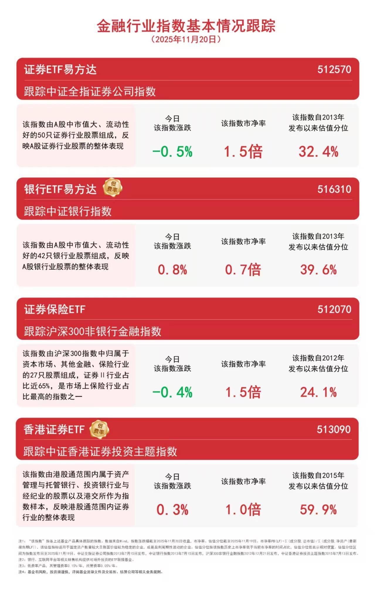大盘今日震荡调整,银行股逆势走强,中国银行涨4%创下历史新高,建设银行、邮储银行涨超3%。截至收盘,中证银行指数上涨0.8%,香港证券指数上涨 0.3%,沪深300非银行金融指数下跌0.4%,中证全指证券公司指数下跌0.5%。 中信证券指出,据金融统计数据报告显示,居民存款和非银存款转移持续活跃,年底银行将加大对流动性管理的关注。三季度银行息差初步企稳,盈利水平 保持稳定。投资方面,银行板块低估值隐含的价值空间依旧显著,年底步入长线资金配置时段,有助催化银行股市场表现。 令日 该指数涨跌 该指数市净率 该指数自 发布以来们 1.0倍 59. 跟踪中证香港证券投资主题指数 该指数由港股通范围内属于资产 管理与托管银行、投资银行业与 经纪业的股票以及港交所作为指 数样本,反映港股通范围内证券 行业的整体表现 注! "该指数"报者上述基金产品具体调踩的指数。数据来自Wird,指数消说相聚至2025年11月20日收盘。市净罩、估值分位就至2025年11月19日,市净率19LF)=Σ《成分股,吃市值》/Σ 报告期JF),该估值指标透用于固定资产敷量较大目新面价值段为稳定的企业,或是盈利尾明在波动的企业。估值分位伤该拆费 ...