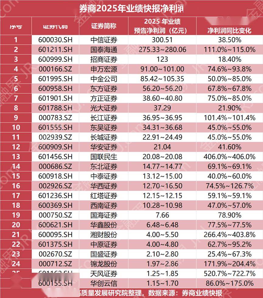 截至2026年2月初,已有26家上市券商或其核心主体披露了业绩快报或预告。一个引人瞩目的共同点是,这26家券商的净利 润全部预告实现同比增长,呈现出近年来罕见的"满堂红"局面。 多家券商在公告中阐述了业绩增长的动力来源。在22家披露了具体原因的机构中,财富管理业务被普遍视为核心引擎,紧 随其后的是投资业务,共有16家券商在此领域取得同比增长;整体而言,财富与投资两大业务板块构成了本轮券商业绩增 长的主要驱动力。 | | | 券商2025年业绩快报净利润 | | | | --- | --- | --- | --- | --- | | HRS | HE SELL HE | 证券简称 | 2025 年业绩 | | | | | | 预告净利润(亿元) | 净利润同比变化 | | 1 | 600030.5H | 中信证券 | 300.51 | 38.50% | | 2 | 601211.SH | 国泰海通 | 275.33~280.06 | 111.0%~115.0% | | 3 | 600999.5H | 招商证券 | 123 | 18.40% | | 4 | 000166.SZ | 甲万宏源 | 91.00~101 ...