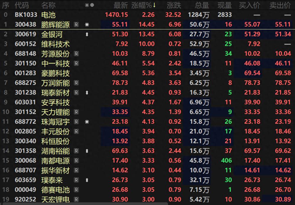 11月27日早间,电池及固态电池板块一同拉升,电池指数盘中一度涨超2.8%,固态电池指数也涨逾2%。个股方面,金银河、鹏辉能源等涨超 10%,固态电池板块盘中掀起涨停潮,联得装备、壹石通,明冠新材等5股盘中20CM涨停,道明光学、光华科技等一同封死涨停板,石大胜 华、芳源股份等多股纷纷跟涨。 | 18 | 代码 音标 | | | 有哪 | | 专题影院 解 | 涨跌 | 息量 | 现量 | 买入价 | 卖出价 | | --- | --- | --- | --- | --- | --- | --- | --- | --- | --- | --- | --- | | 0 | BK1033 电池 | | | | 1470.15 | 2.26 | 32.52 | 1284 万 | 2833 | | | | 1 | 300438 | 鹏辉能源 | H | 兼 | 55.11 | 14.45 | 6.96 | 50.6 户 | 16 | 55.07 | 55.11 | | 2 | 300619 金银河 | | | ** | 51.30 | 13.45 | 6.08 | 27.7万 | 23 | 51.29 | 51.34 ...