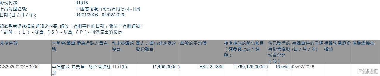 | 表格序號 | 大股東/董事/最高行政人員名 作出披露的 買入 / 賣出或涉及的 每股的平均價 | | 持有權益的股份數目 佔已發行的 有關事件的日期 | | | --- | --- | --- | --- | --- | | | 股份數目 | | ( 請參閱上述 * 註 | 有投票權股(日/月/年) 有 | | | | | | 份自分比 | | | | | | 30/0 3 | | CS20260204E00061 | 中信证券-开元单一资产管理计1101(L) | 11,460,000(L) | HKD 3.1835 1,790,129,000(L) | 16.04(L)03/02/2026 | 格隆汇2月4日丨根据联交所最新权益披露资料显示,2026年2月3日,中广核电力(01816.HK)获中信证券-开元单一资产管理计划在场内以每股均价3.1835港元 增持1146万股,涉资约3648.29万港元。 增持后,中信证券-开元单一资产管理计划最新持股数目为1,790,129,000股,持股比例由15.93%上升至16.04%。 | 股份代號: | 01816 | | --- | --- | | 上市法國 ...