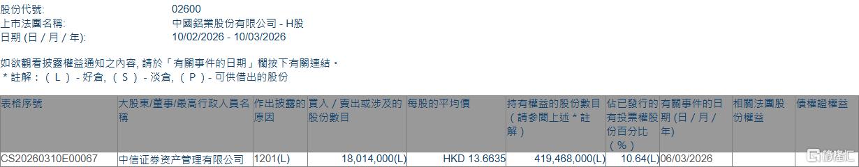 格隆汇3月10日丨根据联交所最新权益披露资料显示,2026年3月6日,中国铝业(02600.HK)遭中信证券资产管理有限公司在场内以每股均价13.6635港元减持 1801.4万股,涉资约2.46亿港元。 减持后,中信证券资产管理有限公司最新持股数目为419,468,000股,持股比例由11.09%下降至10.64%。 | 股份代號: | 02600 | | --- | --- | | 上市法國名稱: | 中國鋁業股份有限公司 - H股 | | 日期 (日 / 月 / 年): | 10/02/2026 - 10/03/2026 | | 表格序號 | 大股東/董事/最高行政人員名 作出披露的 買入 / 賣出或涉及的 每股的平均價 | | | | 持有權益的股份數目 佔已發行的有關事件的日 相關法 | | --- | --- | --- | --- | --- | --- | | | 股份數目 | 原因 | | | 請參閱上述*註 有投票權股期(日/月/ 份權益 | | | | | | | 份自分比 细 | | CS20260310E00067 | 中信证券资产管理有限公司 | 1201(L) | 18.014. ...