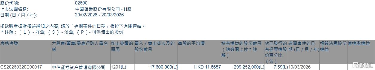格隆汇3月20日丨根据联交所最新权益披露资料显示,2026年3月19日,中国铝业(02600.HK)遭中信证券资产管理有限公司在场内以每股均价11.6657港元减 持1760万股,涉资约2.05亿港元。 | 表格序號 | 大股東/董事/最高行政人員名 作出披露的 買入 / 賣出或涉及的 每股的平均價 | | | 持有權益的股份數目 佔已發行的 有關事件的日 相關 | | | --- | --- | --- | --- | --- | --- | | | 開因 | 股份數目 | | (請參閱上述 * 註 有投票權股 期(日 / 月 / 年)權益 | | | | | | | 份自分比 | | | | | | | ( % ) | | | CS20260320E00017 | 中信证券资产管理有限公司 1201(L) 17,600,000(L | | HKD 11.6657 | 299,252,000(L) | 7.59(L) 19/03/2026 | 减持后,中信证券资产管理有限公司最新持股数目为299,252,000股,持股比例由8.03%下降至7.59%。 | 股份代號: | 02600 | | --- | - ...
