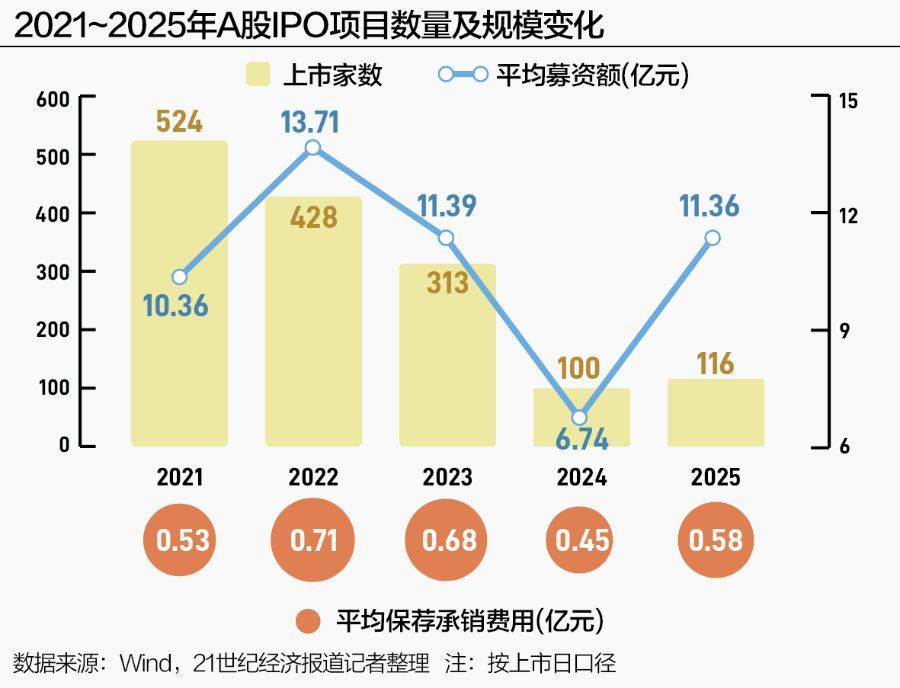 21世纪经济报道记者 刘夏菲 过去五年,A股IPO市场呈现明显的周期性演变轨迹。 刚刚结束的2025年,A股和港股IPO市场双双迎来久违的暖意。不少市场人士开始讨论,"投行的IPO大年是不是要来了?" 而上一个A股、港股齐丰收的"IPO大年",还是五年前的2021年。 回看2021年,那仿佛是上一个周期的尾声。彼时,无论是A股还是港股,IPO的数量和规模尚处于阶段性的高点。 此后的几年时间里,IPO市场历经寒潮,券商投行业务也随之经历漫长的蛰伏。 五年过去,市场正在重拾升势。2025年,A股新上市企业数量回升至116家,募资总额达到1318亿元,同比几乎翻番。港股市场 更以超2858亿港元的IPO募资总额,时隔多年重回全球募资榜首。 在规模的回升之外,五年间,市场的逻辑、竞争的格局是否生变? 穿越IPO市场的潮起潮落,我们一起回看作为资本市场"弄潮儿"的券商投行,在业务版图和核心打法上的"变"与"不变"。 · A股篇A股IPO的"质变"五年谁的"应变"能力拔得头筹? 在2021年、2022年的"IPO大年"后,接下来的两年时间里,伴随全面注册制的正式落地和IPO节奏的阶段性收紧,A股IPO项目数 量持续回落。 ...