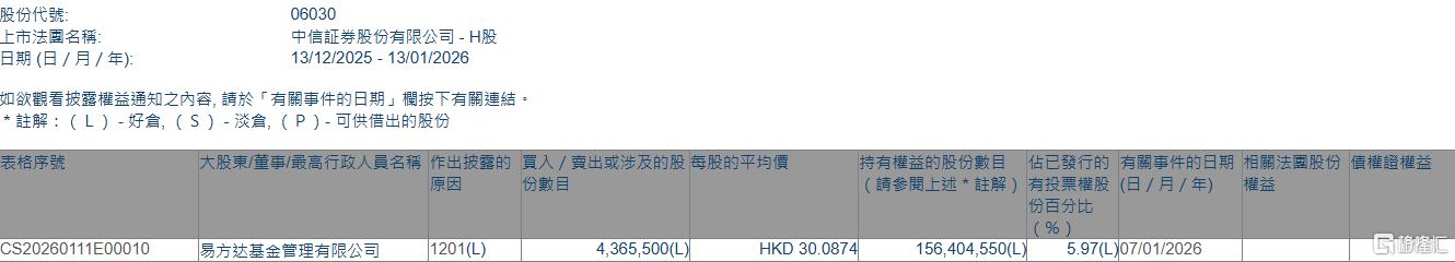减持后,易方达基金管理有限公司最新持股数目为156,404,550股,持股比例由6.14%下降至5.97%。 | 股份代號: | 06030 | | --- | --- | | 上市法國名稱: | 中信証券股份有限公司 - H股 | | 日期 (日 / 月 / 年): | 13/12/2025 - 13/01/2026 | 格隆汇1月13日丨根据联交所最新权益披露资料显示,2026年1月7日,中信证券(06030.HK)遭易方达基金管理有限公司在场内以每股均价30.0874港元减持 436.55万股,涉资约1.31亿港元。 | 表格序號 | 大股東/董事/最高行政人員名稱 作出披露的 買入 / 賣出或涉及的股 每股的平均價 | | | | 持有權益的股份數目 佔已發行的 有關事件的 | | | --- | --- | --- | --- | --- | --- | --- | | | 分數目 | 原大 | | | (請參閱上述*註解)有投票權股 (日/月/4 | | | | | | | | 份百分比 | | | Street Station of Antiques of Anyth of Children o ...