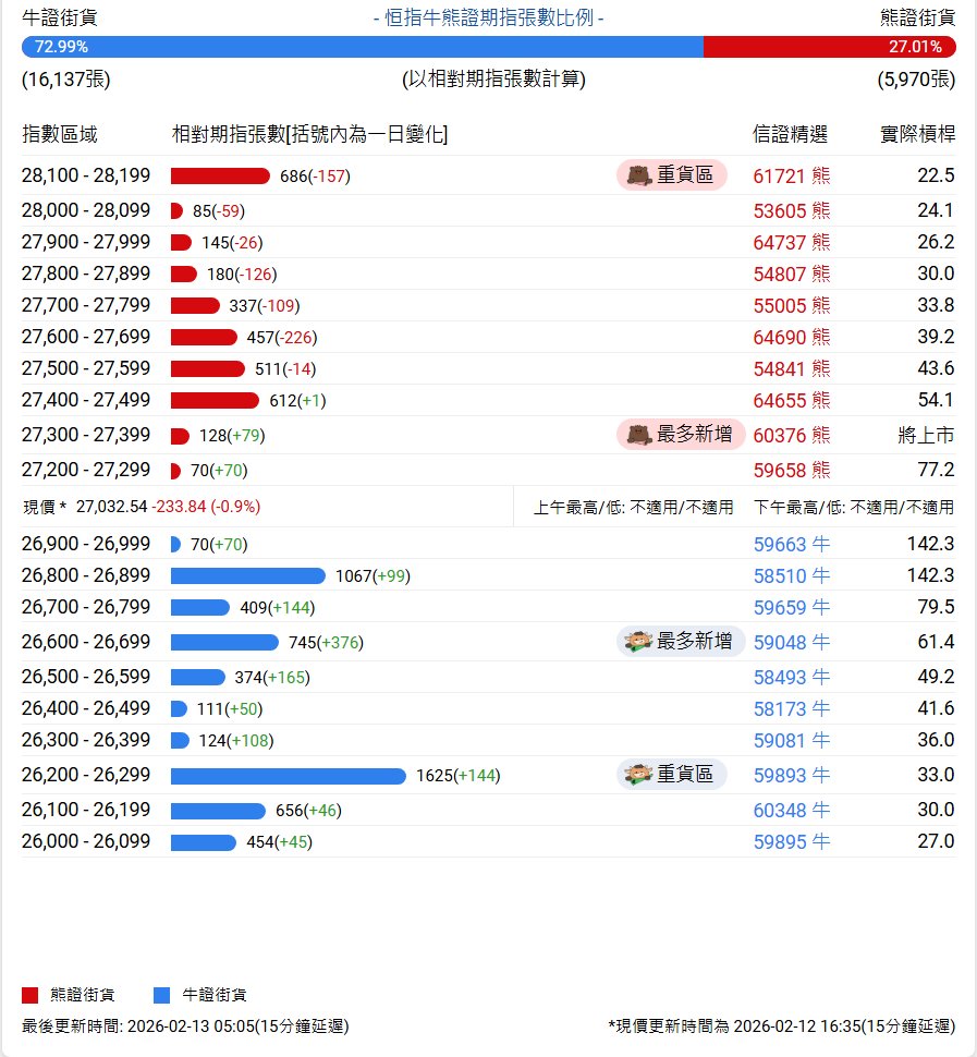 智通财经APP获悉,截至2月13日,恒指最新的牛熊街货比例为73:27。 | 牛證街貨 | - 恒指牛熊證期指張數比例- | | | 熊證街貨 | | --- | --- | --- | --- | --- | | 72.99% | | | | 27.01% | | (16,137張) | (以相對期指張數計算) | | | (5,970張) | | 指數區域 | 相對期指張數[括號內為 一日變化 | | 信譜精選 | 曹際槓桿 | | 28,100 - 28,199 | 686(-157) | 車貨品 | 61721 配 | 22.5 | | 28,000 - 28,099 | 85(-59) | | 53605 NE | 24.1 | | 27,900 - 27,999 | 145(-26) | | 64737 NE | 26.2 | | 27,800 - 27,899 | 180(-126) | | 54807 NE | 30.0 | | 27,700 - 27,799 | 337(-109) | | 55005 NE | 33.8 | | 27.600 - 27.699 | 457(-226) | | ...