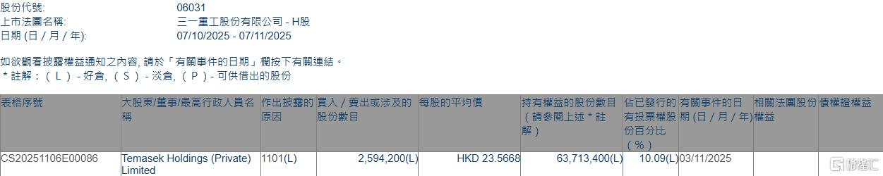 淡马锡控股公司增持三一重工(06031)259.42万股 每股作价约23.57港元