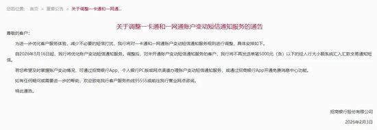 近日,招商银行宣布,对一卡通和一网通账户变动短信通知服务进行优化调整,引发市场广 泛关注。 根据公告内容,自2026年3月16日起,招商银行将对未开通账户变动短信通知服务的客户, 不再发送单笔5000元(含)以下的经人行大小额系统汇入汇款交易通知短信。 这一举措并非孤例,而是银行业在净息差持续收窄、经营压力加大背景下推进降本增效的的 缩影。据不完全统计,自2025年以来,已有中国银行、甘肃银行、广东华兴银行等十余家银 行公告上调动账短信的免费通知门槛,部分机构起点金额提至千元。新浪金融研究院查询国 有行、股份行App发现,对于小额账户变动的短信通知服务,银行每月收费1元至4元不等。 招商银行短信服务调整落地 单笔5000以下入账不再短信通知 据公告,招商银行此次调整旨在进一步优化客户服务体验,减少不必要的短信打扰。 该行同时表示,若客户希望及时掌握账户变动情况,可通过招商银行App、个人银行PC版或 网点渠道办理账户变动短信通知服务,或通过招商银行App开通免费消息中心功能。 新浪金融研究院查询招商银行App获悉,账户变动短信通知服务的收费标准为"3元/月/卡", 定制后当月费用将于次月统一扣收。同时,65岁 ...