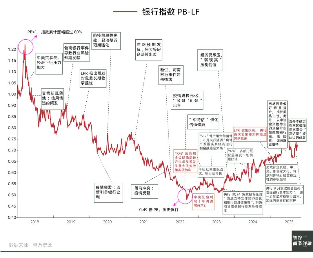 麦肯锡将行业当前阶段,描述为"巅峰之后,拐点之前"。在资本市场,你能找到这句话最形象的解释。 在经历了2018年的巅峰时刻(PB>1,指数累计涨幅超过80%)后,银行股迎来了长达四年的下行周期——地缘摩擦导致全球经济下行压力,资管新规落 地带来行业阵痛,包商银行破产进一步发酵行业风险预期......2022年10月,银行股估值跌落至0.49倍PB的历史低谷。 2026年的银行业,会比现在更好吗? 此后各种猛药轮番上阵——中央汇金时隔十年再度增持、长期资金不断加码、地产风险有序出清......银行板块开始了缓慢复苏。 所谓拐点,绝非仅仅是业绩和估值修复的拐点,它应是全行业发展思路变化之拐点,应是增长模式切换之拐点,应是客群经营风格转换之拐点。告别陈旧 模式堆砌的巅峰,拥抱新纪元的阵痛和机遇。 惟其如此,熬过的寒冬才有价值。 01 银行业的低谷,早该来了。 从利润表现来看,2003年开始的18年里,银行业始终稳居前三。而在2021年之后的四年里,银行业更是一骑绝尘。 今年三季度,行业净息差降幅显著收窄,估值回升至0.7倍,似离黎明不远,申万宏源等机构更是明牌:2026年,迎银行长牛。 没人会否认中国银行业的光明前 ...
