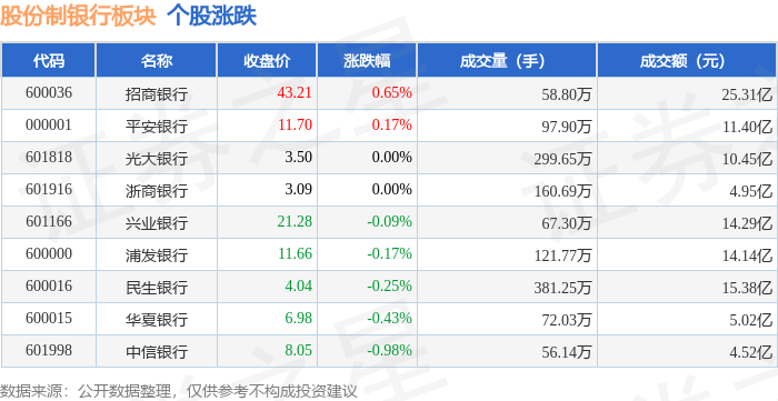 证券之星消息,11月13日股份制银行板块较上一交易日上涨0.04%,招商银行领涨。当日上证指数报收于4029.5,上涨0.73%。深证成指报收于 13476.52,上涨1.78%。股份制银行板块个股涨跌见下表: | 7.0 19 | | --- | | 九八年11日 二十十 块 个股涨跌 | A50ETF (产品代码: 159601) ★ 跟踪:MSCI中国A50互联互通人民币指数 近五日涨跌: 0.09% 从资金流向上来看,当日股份制银行板块主力资金净流入5684.08万元,游资资金净流入1599.28万元,散户资金净流出7283.37万元。股份制银行 板块个股资金流向见下表: | the first the large that the state of the state of the state of | | | | | | | | | --- | --- | --- | --- | --- | --- | --- | --- | | 代码 | 名称 | 主力净流入 (元) | 主力净占比 游资净流入 (元) | | 游资净占比 散户净流入 (元) | | 散户净占比 | | 601166 | 兴业银 ...