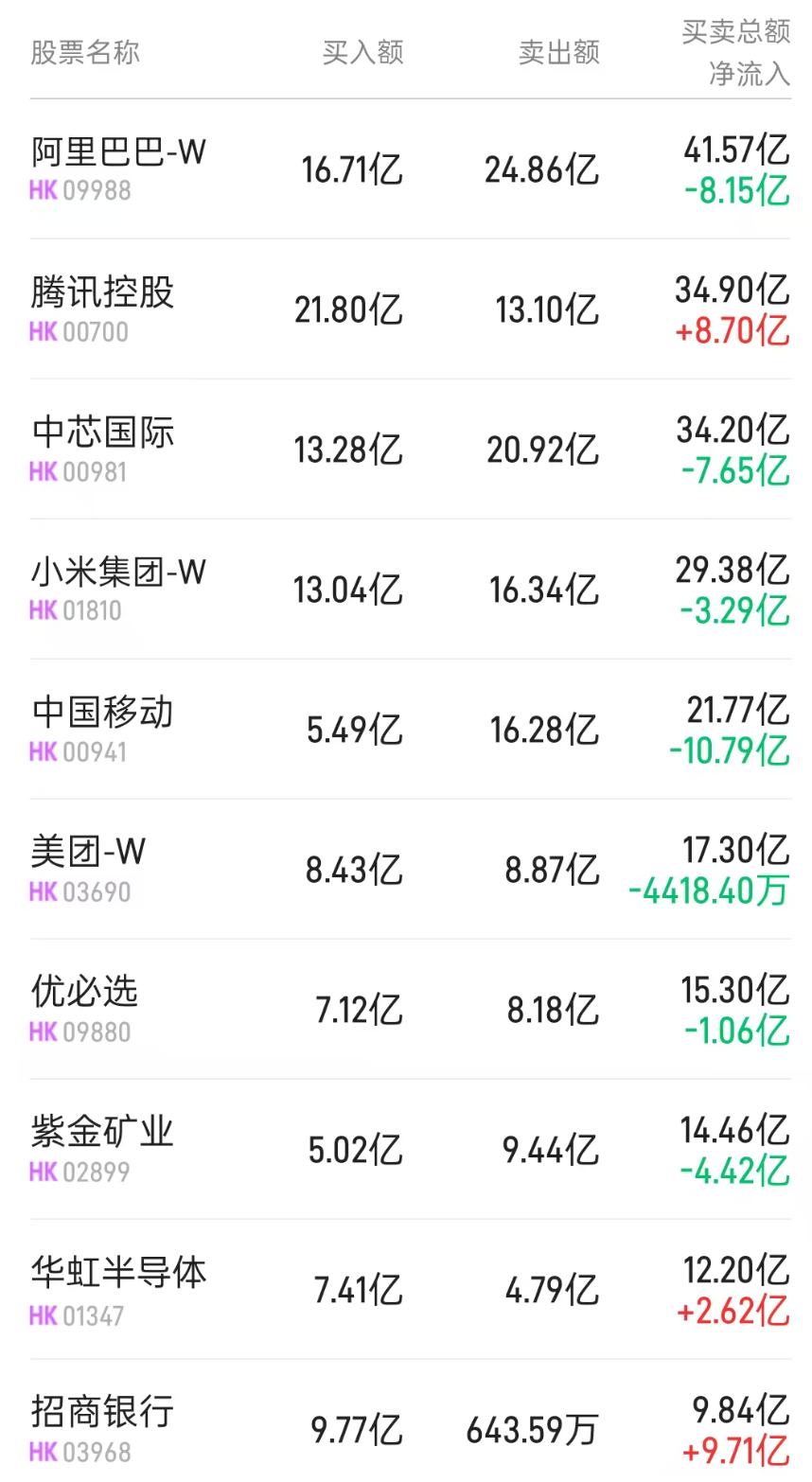 | 港股通(沪)活跃成交股 | | --- | | HK 09988 | 11.4416 | 13.5316 | -2.10亿 | | --- | --- | --- | --- | | 中芯国际 | 12.10亿 | 5.21亿 | 17.31亿 | | HK 00981 | | | +6.89 亿 | | 小米集团-W | 8.04 亿 | 7.57亿 | 15.61亿 | | HK 01810 | | | +4676.56万 | | 美团-W | 4.55亿 | 6.06亿 | 10.61亿 | | HK 03690 | | | -1.50 亿 | | 中国海洋 ... | 3.05亿 | 5.34亿 | 8.38亿 | | HK 00883 | | | -2.29 Z- | | 中国移动 | 2.23亿 | 5.94亿 | 8.17亿 | | HK 00941 | | | -3.71 乙 | | 紫雯贴,不 | 2.60亿 | 4.40亿 | 7.00亿 | | HK 02899 | | | -1.80 亿 | | 优必选 | 3.01亿 | 3.55亿 | 6.55亿 | | HK 09880 | ...
