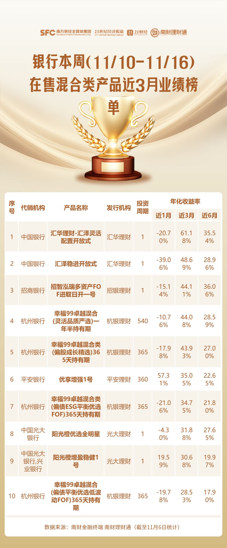 | 2 | 中国银行 | 汇产品电子放式 | 汇华理财 | 1 | -39.0 | 48.6 | 28.9 | | --- | --- | --- | --- | --- | --- | --- | --- | | | | | | | 6% | 9% | 6% | | 3 | 招商银行 | 招智泓瑞多资产FO | 招银理财 | 1 | -15.1 | 44.1 | 36.0 | | | | F进取目分一号 | | | 4% | 1% | 6% | | ব | | 幸福99卓越混合 | | | -10.7 | 44.0 | 28.5 | | | 杭州银行 | (灵活品质严选)一 年半持有期 | 杭银理财 | 540 | 6% | 8% | 9% | | | | 幸福99卓越混合类 | | | -17.9 | 43.9 | 27.0 | | 5 | 杭州银行 | (偏股成长精选)36 5天高有期 | 杭银理财 | 365 | 8% | 3% | 0% | | 6 | 平安银行 | 优享增强1号 | 平安理财 | 360 | 57.3 | 35.0 | 22.6 | | | | | | | 1% | 5% | 5% ...