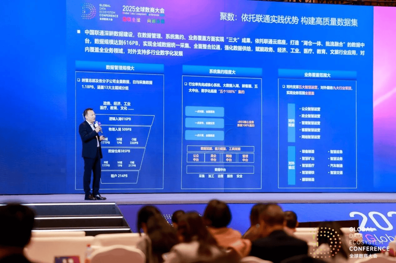 由上海市数据局、浦东新区人民政府指导,上海数据集团主办的2025年"数据要素×"大赛全国总决赛颁奖仪式暨全球数商大会于11月25日在上海国际会议中 心隆重启幕。 大会聚焦数据要素市场化配置、数字技术创新应用等关键领域,汇聚全球顶尖数字经济人才、数商企业、科研机构等资源,搭建产学研用协同创新平台,推 动构建数商生态体系,打造数商沟通交流平台,为全国数据要素体系建设贡献上海智慧与方案。 中国联通全资子公司——联通数智副总经理李振军出席开幕式"中国联通护航企业国际合作'申帆'行动启动仪式"并在主论坛发表《数据要素运营实践分享》 主题演讲。 李振军提到:目前以数据、智能、应用为核心的数据要素市场发展日渐成熟,推动行业向更高价值阶段迈进。数据不仅要供得出,流得动,还要用得好。中 国联通已形成"可信筑基、聚数助智"特色能力,构建了"数、智、用"可持续发展新生态。 聚数:敢为人先,积累400T行业高质量数据集 在经济领域,基于联通元景经济垂类大模型和"151N"大数据资源底座,构建全国经济高质量数据集,建立7大多源数据主题库,服务30+部委、20+省、 100+地市单位。(来源:中国联通) 筑基:元景作底,推进数据工程化建 ...