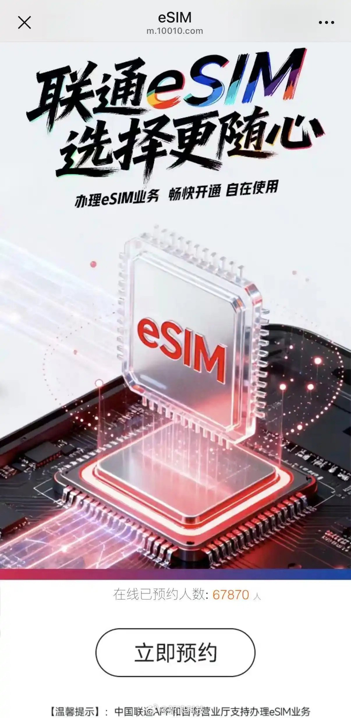 中国联通获批eSIM手机运营服务商用试验,全国预约通道上线