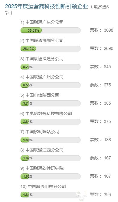 | 1)中国联通广东分公司 | | | | --- | --- | --- | | 35.89% | 票数: | 3698 | | 2)中国联通深圳分公司 | | | | 26.10% | 票数: | 2690 | | 3)中国联通福建分公司 | | | | 8.20% | 票数: | 845 | | 4)中国联通广州分公司 | | | | 6.55% | 票数: | 675 | | 5)中国电信陕西公司 | | | | 3.74% | 票数: | 385 | | 6)中电信数智科技有限公司 | | | | 3.64% | 票数: | 375 | | 7)中国移动咪咕公司 | | | | 1.80% | 票数: | 186 | | 8)中国联通门西分公司 | | | | 1.62% | 票数: | 167 | | 9)中国联通软件研究院 | | | | 1.62% | 票数: | 167 | | 10)中国联通山东分公司 | | | | 1.61% | : 来源 | 165 | 具体来看,截至1月13日上午9点,广东联通在票数上以3698票,暂列第一,具有领先优势。深圳联通以 2690票跟随其后,福建联通投票 ...