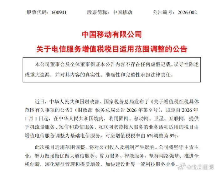 文字:综合新华社 央视新闻 21世纪经济报道 第一财经 IC供图 记者2月1日从国家税务总局获悉,国家税务总局制发了《关于起征点标准等增值税征管事项的公告》, 就起征点标准判定、税收优惠政策适用等增值税征管事项作了进一步明确,细化操作要求,推动增值税 法及其实施条例落实落地。 三大运营商 增值税税率升至9%,将影响收入利润 1月31日,财政部、税务总局发布《关于增值税征税具体范围有关事项的公告》,明确了适用9%和6% 增值税税率范围,以及销售服务、无形资产、不动产具体范围,这涉及多档税率。该《公告》自2026年 1月1日起施行。目前中国增值税税率主要有三档,其中基本税率是13%,两档优惠税率分别是9%和 6%。 2月1日,中国移动(600941.SH)公告称,《关于增值税征税具体范围有关事项的公告》规定自2026年1月 1日起,在中华人民共和国境内,利用固网、移动网、卫星、互联网,提供手机流量服务、短信和彩信 服务、互联网宽带接入服务的业务活动适用的税目由增值电信服务调整为基础电信服务,对应增值税税 率由6%调整为9%。此次税目适用范围调整,将对公司收入及利润产生影响。 同日,中国电信(601728.SH)、 ...
